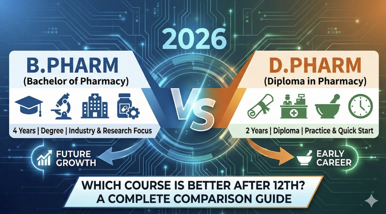 After completing Class 12th with Science (PCB or PCM), many students explore career options in the medical and pharmaceutical field. Among the top career choices after 12th Science are B.Pharm (Bachelor of Pharmacy) and D.Pharm (Diploma in Pharmacy).B.Pharm vs D.Pharm Read More...
